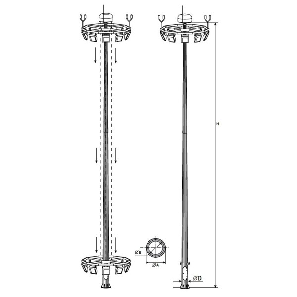 Высокомачтовые опоры освещения, предназначенные для монтажа большого количества светильников (до 12) на высоте, позволяющей увеличить их продуктивность и площадь охвата. Опоры ВМО-30-В заменяют собой сразу несколько стандартных опор освещения, что позволяет полностью окупить их увеличенную стоимость, связанную не только с большой металлоемкостью, но и со сложной организацией конструкций. При этом такие металлоконструкции отличаются оптимальным для своих габаритов весом, не создают излишней нагрузки на грунт, могут быть использованы для подземного подвода кабельной системы, что позволяет отказаться от протягивания дополнительных проводов. Системы используются на стадионах, на промышленных площадках и т.д. Их гармоничный дизайн и современное исполнение, а также возможность обслуживания без привлечения габаритной спецтехники, которой часто требуется специальный подъезд, позволяют использовать их при обустройстве жилых комплексов.